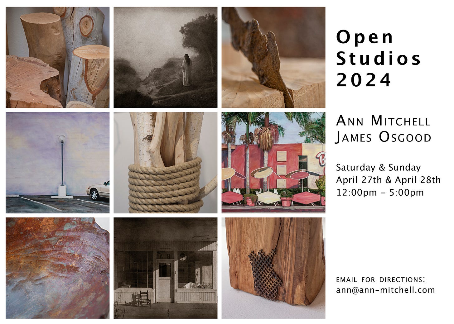 A few years ago, my husband and I went to an Open Studio event hosted by Linda King in her home studio. She’d gotten tired of being reliant on outside forces and decided to take charge of her artistic career. As we left, James (sculptor) turned to me and said “why can’t we do something like that?” So…we are! I’m looking forward to seeing folks IRL and building community. If you’re in the SoCal area, we’d love to have you - email me at ann@ann-mitchell.com for the address and directions.